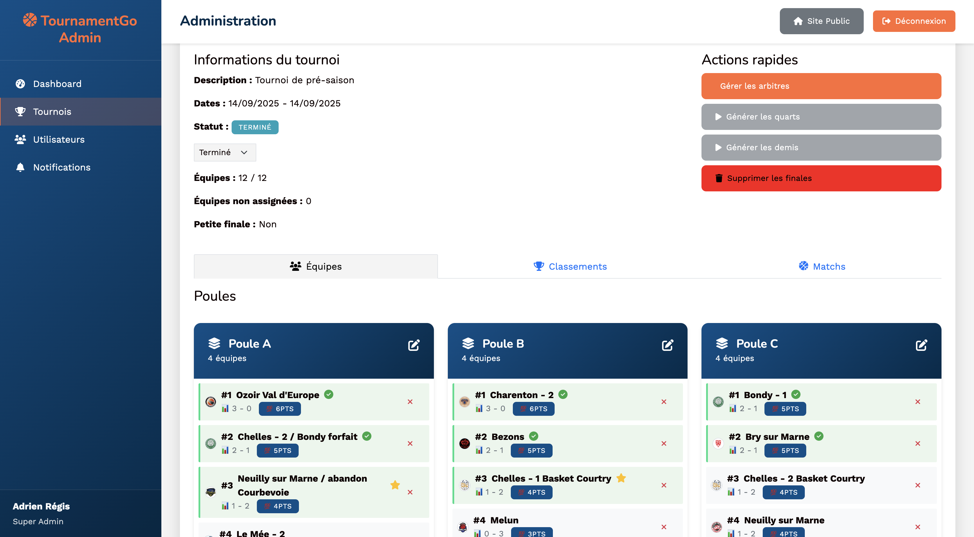 Application de gestion de tournois de basket-ball développée pour répondre aux besoins d'organisation rapide et efficace. Gestion complète des équipes, poules, classements automatiques et planning des arbitres.